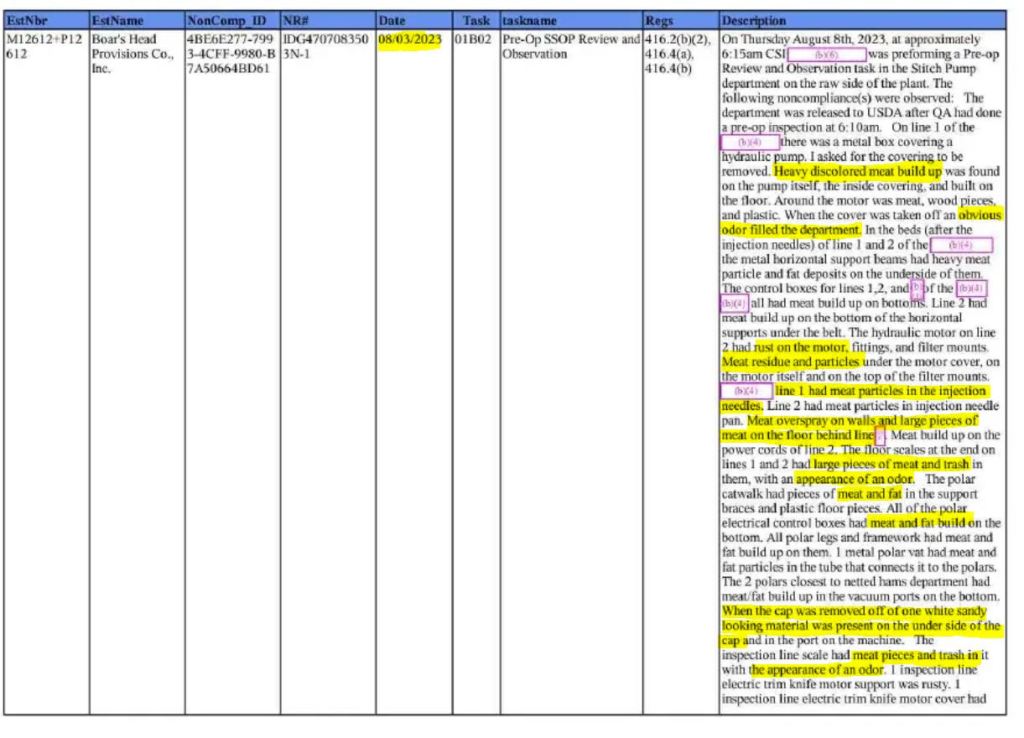 United States Department of Agriculture Food Safety and Inspection Service. (2024). Noncompliance Report, EstablishmentNumber(s): M12612+P12612 from 08/01/2023 to 08/02/2024 (M12612+P12612). https://www.scribd.com/document/763954974/USDA-FOIA-records-requested-by-Alexander-Tin#fullscreen&from_embed